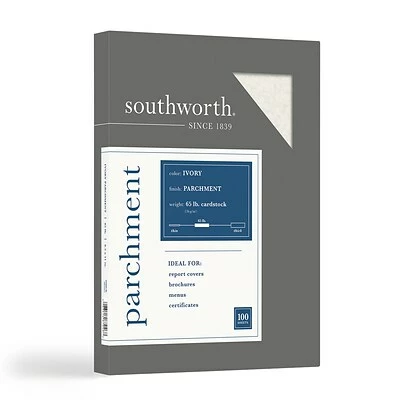 Print impressive menus, programs, proposals, resumes, and more with this heavyweight, 65-pound parchment card stock. This box contains 100 sheets of letter-size Southworth parchment paper perfect for restaurants, conferences, and special events.