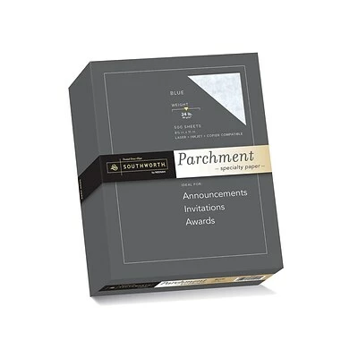 Provide staff members with certificates, give clients invitations, and design other sophisticated documents with this specialty paper. Featuring a 24-pound paper weight, this acid-free paper offers a durable, high-quality look and feel, while the blue color adds a unique touch to each printout. This Southworth specialty paper boasts an upscale parchment finish for a sleek, professional appearance.