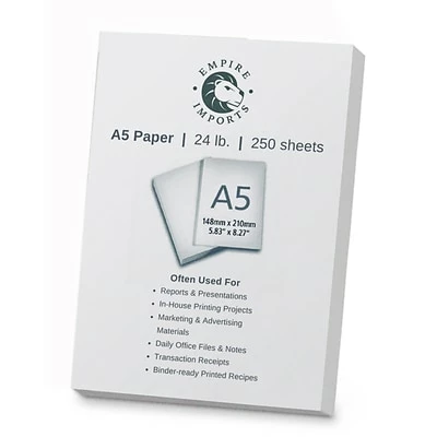 Empire Imports A5 Paper is a specialty sized paper that has a wide variety of uses. This paper is made from premium quality 24 lb. stock, and is great for professional quality projects and casual ones alike. A5 paper is perfect for use as a filler paper for FiloFax products. A5 paper can be used in any printer, for many purposes like reports, marketing materials, greeting cards, memos and daily notes. The paper can also be folded in half to make smaller, A6 sized sheets. Each ream contains 250 sheets.