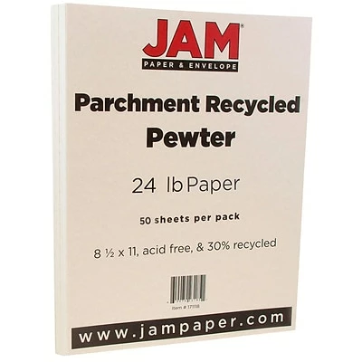 Want to make a lasting impression without being too flashy? JAM Paper® Pewter Parchment Recycled Paper is exactly what you need for your next project. This paper is perfect for every occasion because of its classy color and unique texture. Each sheet of this high quality 24lb paper measures 8.5 x 11 inches in size. Because of its subtle beauty, parchment paper is perfect for invitations, menus, promotional material, and arts and crafts. To make this paper even more special, its is made from 30% post consumer paper. Because we think its important to not only be stylish, but also eco-friendly. This pack contains 50 sheets of paper.