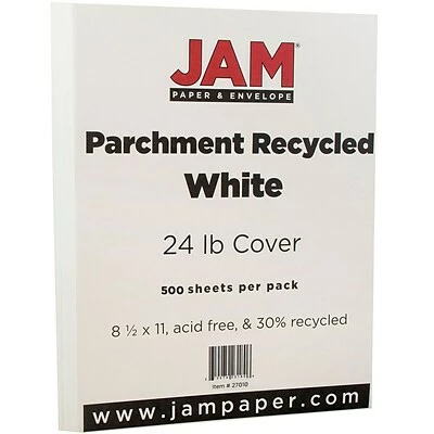 JAM Paper® White parchment recycled paper is used to create exclusive invitations, letters, announcements, menus, signs and more, comes in a pack of 500. Paper has a dimension of 8 1/2″ x 11″.