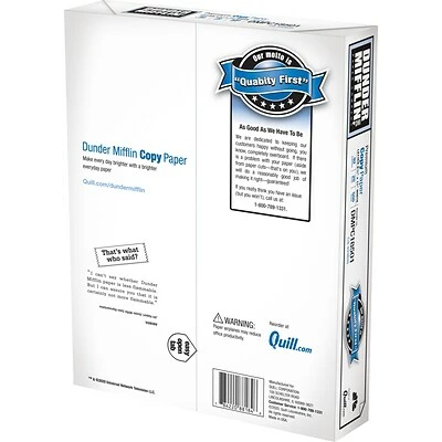 Dunder Mifflin Premium copy paper measures 8 1/2″ x 11″ and is great for copiers, inkjet as well as laser printers. Acid free copy paper features poly-wrapped reams that provides visual appeal and protective strength.