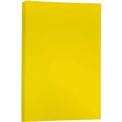 Brilliant and sunny, this Yellow Recycled JAM Paper® Bright Colored Tabloid Cardstock is just what you need to brighten up anyone’s day! This cardstock is not only bold and bright, it is high quality and feels it. It is made of 65lb paper, so it is sturdy and reliable. Don’t worry about ripping or bending this paper with ease. The yellow color is a memorable and reminiscent of a shade of sunflower, so you can be sure that it will catch anyone’s eyes no matter what you use it for. Some examples of perfect usage would be promotional projects, business mailings, flyers, posters, brochures, newsletters, cards, pamphlets, arts and crafts and more! This cardstock measures 11 x 17 inches, is a tabloid size which makes it as big as it is beautiful. It is made from 30% recycled content and is sold in packs of 50.