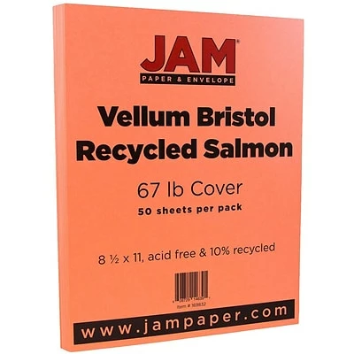 Whether you are making DIY invitations or cards and need a cool overlay, or maybe you have an arts and crafts project or professional need for cardstock, look no further than JAM Paper® Translucent Vellum Cardstock. This is perfect to use when you want to add a special touch to any project due to its high quality color and vellum finish. It is a beautiful shade of salmon and it boasts a unique translucent finish. The smooth surface is also great to write and print on. Use this cardstock to make overlays for invitations and cards, to create beautiful masterpiece arts and crafts projects, drawing, sending out business mailings and more! This cardstock measures 8.5 x 11 inches so it is a standard letter size and sold in packs of 50.