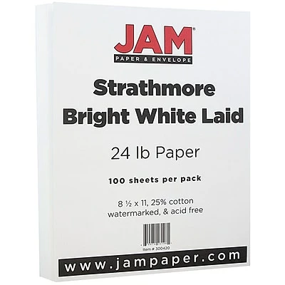 JAM Paper® Strathmore paper in bright white laid color is made from crisp and conservative 30% recycled paper. Paper has dimension of 8 1/2″ x 11″.