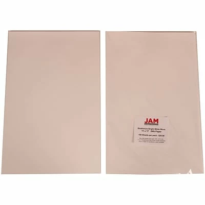 This JAM Paper Strathmore Tabloid Size Cardstock may be white, but it is never boring. Boasting a thick, quality paper as well as a luxurious woven finish, this white cardstock will surely be noticed and remembered. It is made of 88lb paper, so it is reliable and sturdy. Not only that, the stark white Strathmore bright white wove color is the brightest of whites, so your correspondence of project will always look crisp and clean. It is a tabloid size, so it measures 11 x 17 inches. Use it for invitations, cards, notes, letters, business mailings, promotional projects, arts and crafts and more! This cardstock is sold in packs of 50.