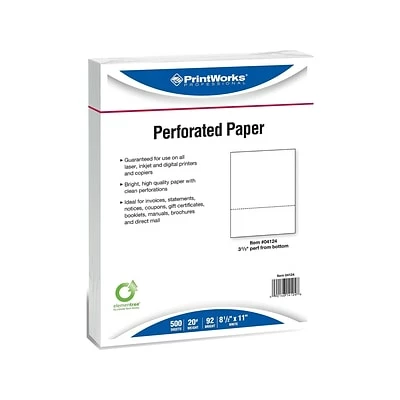 Separate stubs without the need for scissors by using this perforated paper. Featuring a perforation 3.7 inches from the bottom of the sheet, this 20-pound letter-size paper is ideal for creating invoices, order forms, gift certificates, marketing flyers and a variety of other print projects. This 2,500-sheet case of Printworks white perforated paper comes in five reams and accommodates nearly any size office.