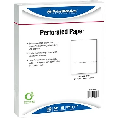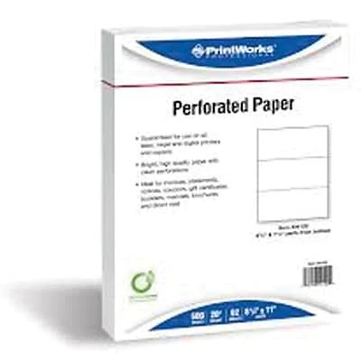 Printworks® Professional Perforated paper in white color measures 8 1/2″ x 11″ and is designed for use in educational or any other commercial firms. Paper of 24 lbs. features pores and is sold as 2500 per case.