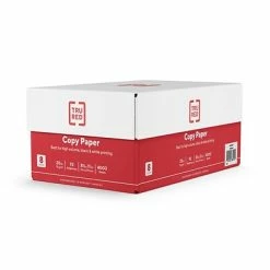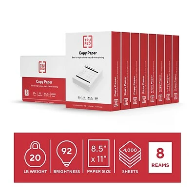 Deliver high-quality results on documents with this copy paper. Compatibility with most machines offers effortless loading, while the 20-pound weight resists jamming in laser and inkjet printers. With a 92 brightness rating, this paper delivers crisp text and images in black and white. This TRU RED 8.5 x 11-inch white copy paper provides 4000 sheets to keep up with daily demands.