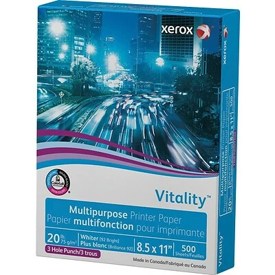 Xerox® Vitality® Multipurpose Printer Paper is a versatile paper that is good for most jobs. Featuring a whiter 92 GE brightness and higher opacity, making it perfect for documents with a crisp, professional look. Features ColorLok® Technology for bolder blacks and vivid colors with ink jet printing and better quality and performance with laser printing. 99.99% jam free on high-speed digital printing equipment. Designed to run in all types of printers and copiers, and ideal for high-volume printing.
