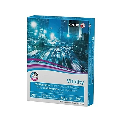 Xerox® Vitality® Multipurpose Printer Paper, 30% Recycled is a versatile paper that is good for most jobs. Featuring a whiter 92 GE brightness and higher opacity. Environmentally responsible with 30% post-consumer recycled and FSC® certified fiber for meeting sustainability initiatives while achieving trouble-free printing. Perfect for documents with a crisp, professional look. Designed to run in all types of printers and copiers.